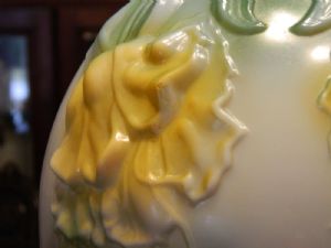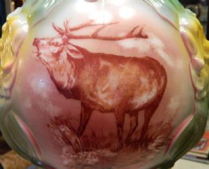 Banquet Lamp with Stag ShadeLarge Banquet lamp with Stag shade. 32 inches high to top of chimney, 6 inches wide at base. In beautiful conditiion ready to use. There is a mold defect in the shade. For more details check out our eBay store or call Janine at 252-238-2146. $575.00